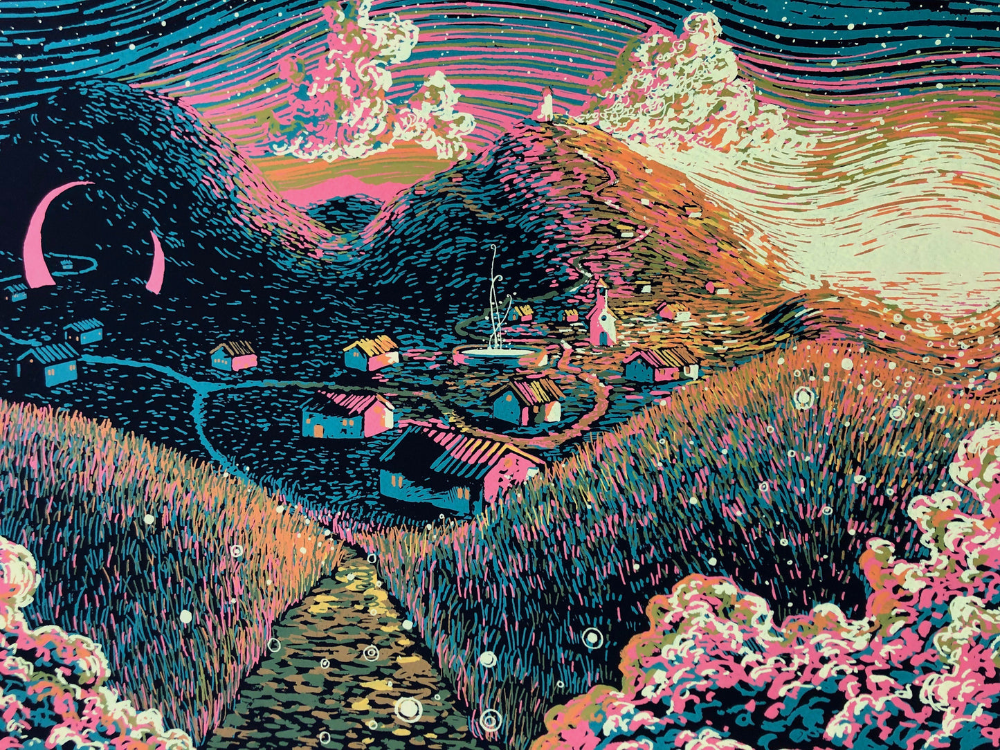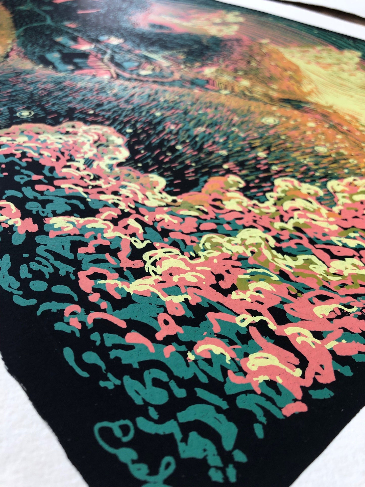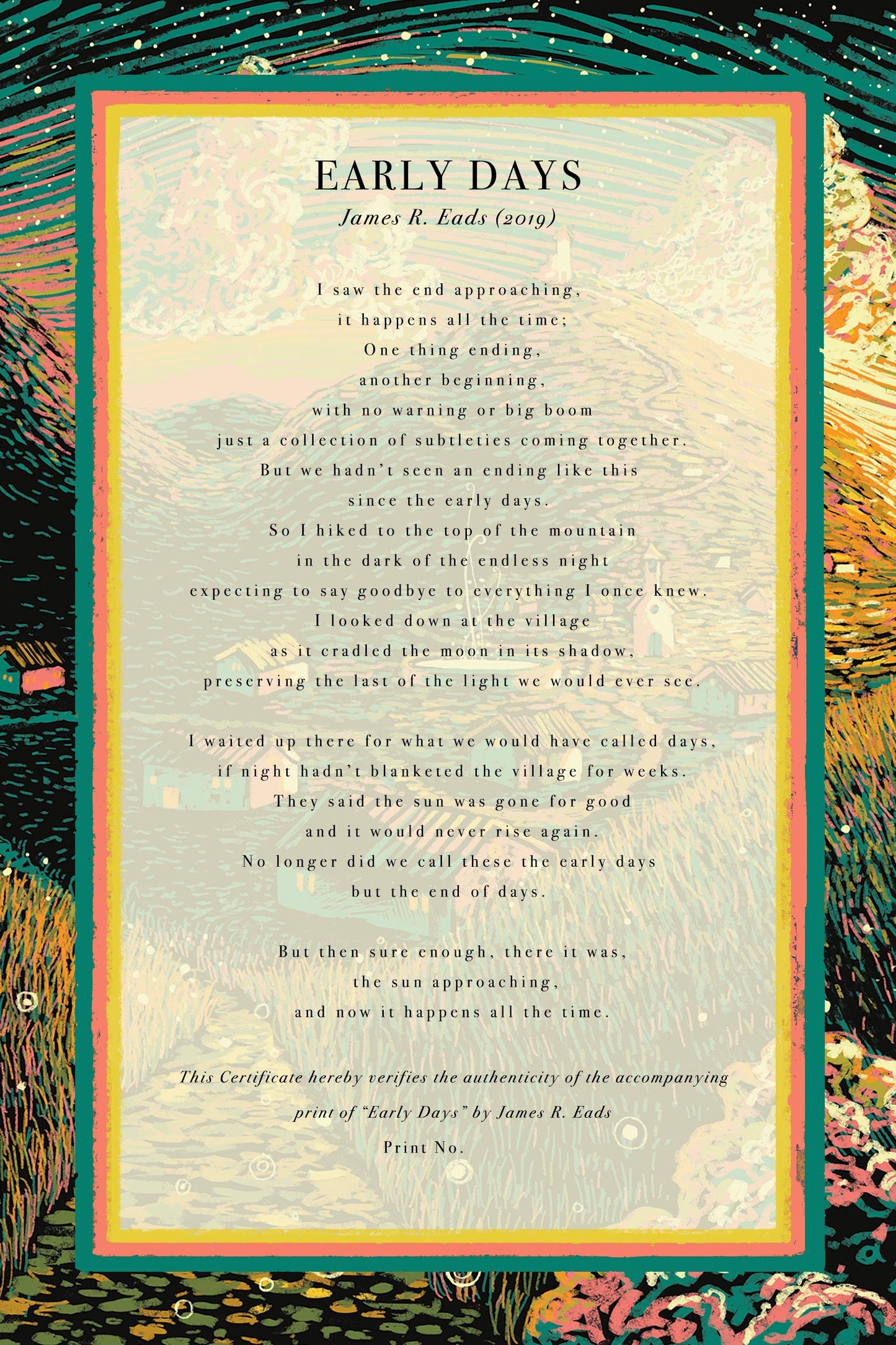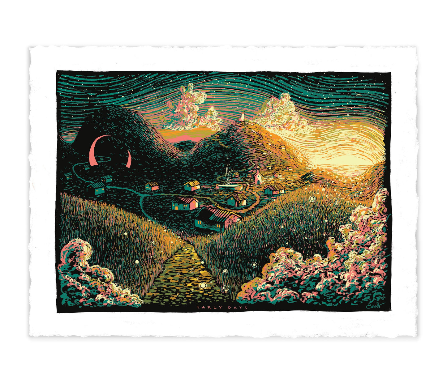 Early Days is an 18" x 24" eight color screen print with a hand-painted black gouache background on 600gsm watercolor paper. Prints are hand-signed and numbered in an edition of 40 per variant and comes with an accompanying poem/certificate of authenticity.