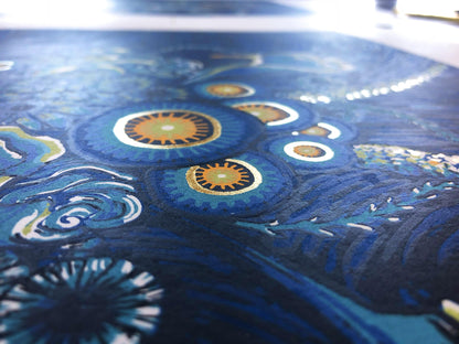 For the limited edition 24K Gold Leaf prints, a seventh layer is added to the design, in which an adhesive is run through the screen. Then gold leaf sheets are applied to the adhesive areas and the excess is carefully brushed off with a goat hair brush. Each print takes a good amount of time to produce so the gold leaf edition is limited to 33 prints.