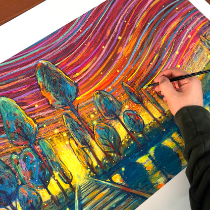 The Morning Came Without You is a 20" x 40" print with hand-painted neon embellishments. Prints are hand signed and numbered in an edition of 15.