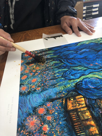 Prints are made by screenprinting a layer of sizing (clear transparent ink with tack) and then Triple 24K gold leaf is applied by hand and brushed off with a goat hair brush.