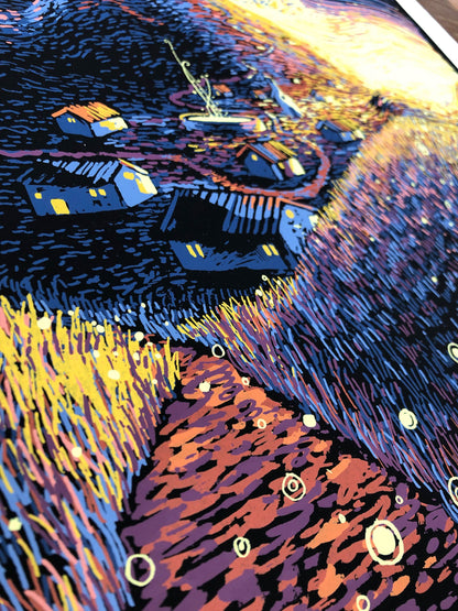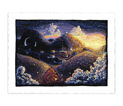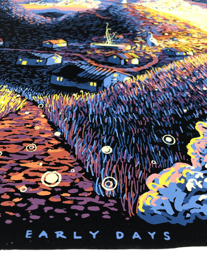 Early Days is an 18" x 24" eight color screen print with a hand-painted black gouache background on 600gsm watercolor paper. Prints are hand-signed and numbered in an edition of 40 per variant and comes with an accompanying poem/certificate of authenticity.