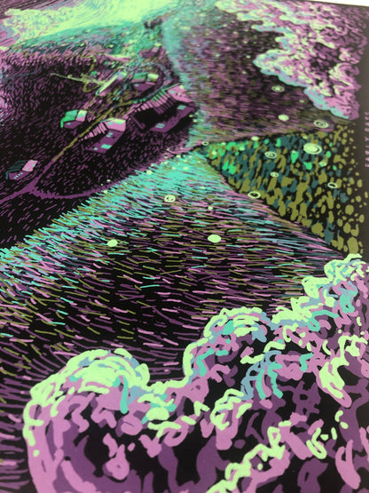 Early Days is an 18" x 24" eight color screen print with a hand-painted black gouache background on 600gsm watercolor paper. Prints are hand-signed and numbered in an edition of 40 per variant and comes with an accompanying poem/certificate of authenticity.