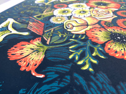 "Flowers for Dreamers" is an 18" x 24" six color screenprint on archival Coventry Rag paper with a 1.5" white border with hand deckled edges.