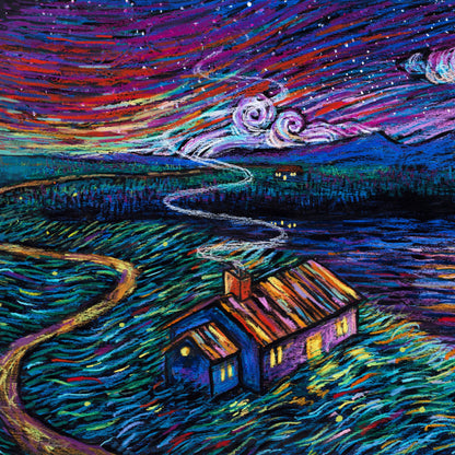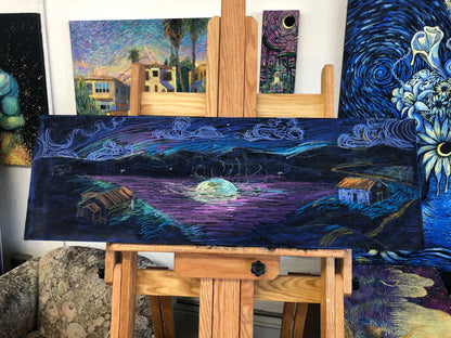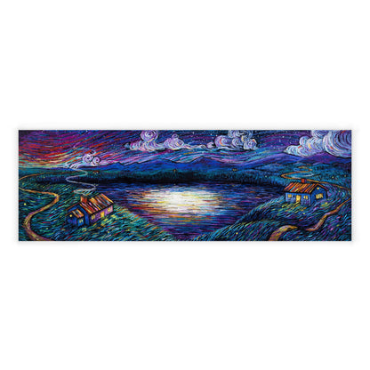 Hidden Moon Lake is an approximately 12" x 36" high quality full-bleed giclee print on archival paper. This piece was originally created with gouache and pastel on panel then reproduced into an edition of prints. Prints are hand signed and numbered in a limited edition of 150.