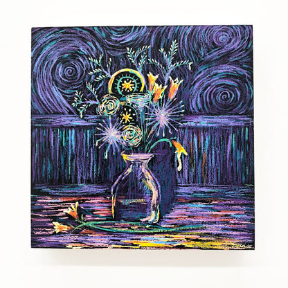 This is a highly hand-embellished test print of Spaceflowers, a 10" x 10" seven color screenprint on a 1.5" cradled wood panel. The print was then drawn on with pastels and finished with a matte UV coating. One of a kind!
