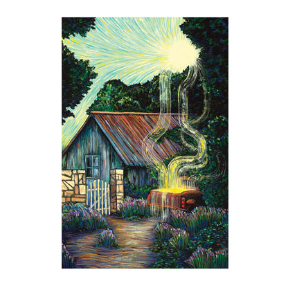 The Red Truck is a 24" x 36" original gouache and pastel piece on 1.5" deep wood panel. The painting is treated with a protective layer of UV varnish.