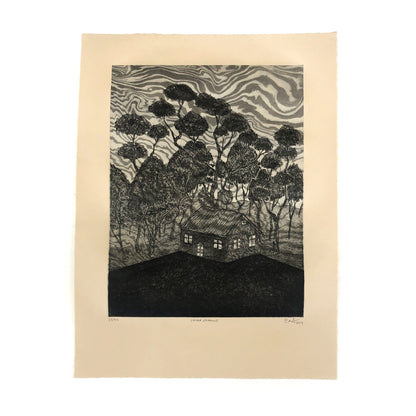 Sharp Shadows is a 12" x 16" copper plate etching on a layer of suminagashi chine colle (learn more) on stonehenge fawn printmaking paper. Prints are hand signed, hand titled and numbered in an edition of 33.
