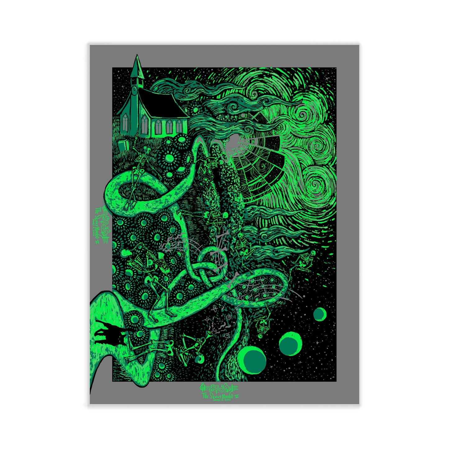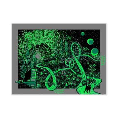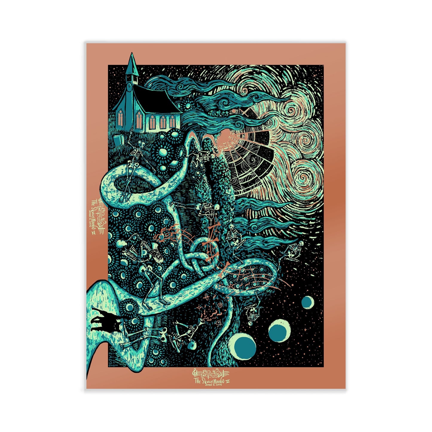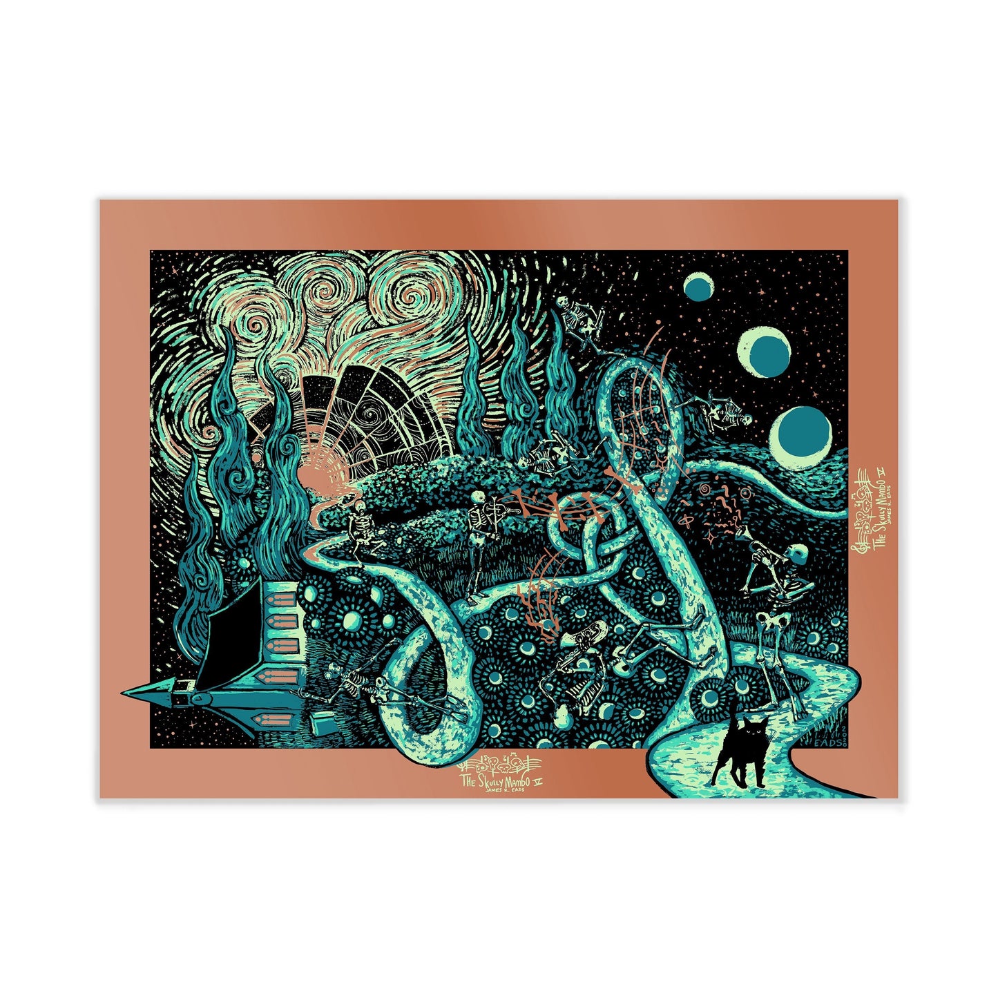 "The Skully Mambo V" is an 18" x 24" four color screenprint on Rose Gold foil and it glows in the dark!* What's unique about this print is that it can be hung vertically or horizontally depending on the viewers preference. Prints are hand signed and numbered in a limited edition of 15.
