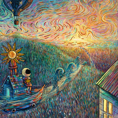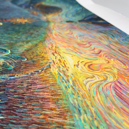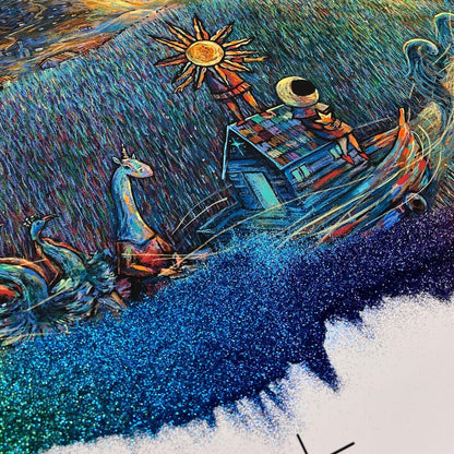 The Parade was originally created as a mixed media gouache and pastel piece on wood panel. I worked on the Parade intermittently for over 2 years. When it was complete I had it professionally photographed and then digitally created the screenprinted layers. For the first layer we apply a glue-like tack in the areas where the glitter sticks. The glitter is then brushed across the print in a rainbow gradient. The glitter layer is then sealed with a clear gloss so that none of the glitter comes off of the print. Then, the print is embellished with a layer of metallic gold ink. Prints are then torn down with deckled-edged, blind embossed with our studio chop, and signed and numbered.