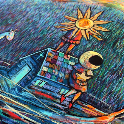 The Parade was originally created as a mixed media gouache and pastel piece on wood panel. I worked on the Parade intermittently for over 2 years. When it was complete I had it professionally photographed and then digitally created the screenprinted layers. For the first layer we apply a glue-like tack in the areas where the glitter sticks. The glitter is then brushed across the print in a rainbow gradient. The glitter layer is then sealed with a clear gloss so that none of the glitter comes off of the print. A second layer of tack is then applied in the gold leaf areas. Gold leaf is then applied by hand and brushed off with a goat-hair brush. Prints are then torn down with deckled-edged, blind embossed with our studio chop, and signed and numbered.