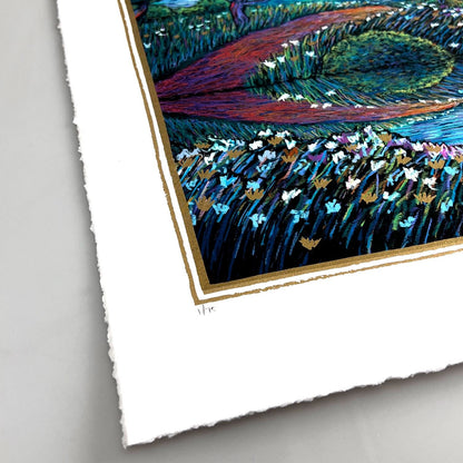 This piece was originally created as a mixed media gouache and pastel piece on wood panel. When it was complete I had it professionally photographed and then digitally created the screenprinted layers. For the first layer we apply a glue-like tack in the areas where the glitter sticks. The glitter is then brushed across the print in a rainbow gradient. The glitter layer is then sealed with a clear gloss so that none of the glitter comes off of the print. The next two layers are screenprinted with metallic inks. Prints are then torn down with deckled-edged, blind embossed with our studio chop, and signed and numbered.