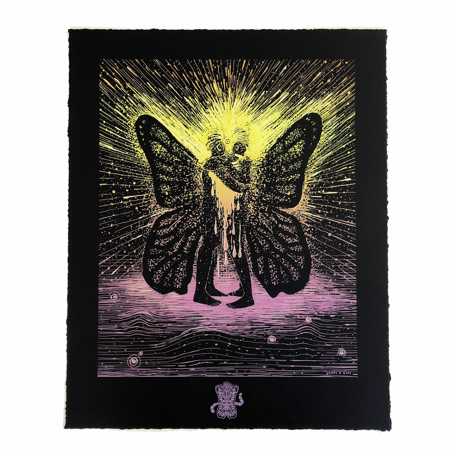 “Turning into You” is a 16” x 20” split fountain screenprint on Neenah Epic Black paper with hand embellished details and deckled edges. The print is available in five different variants, each in very small editions of 13.