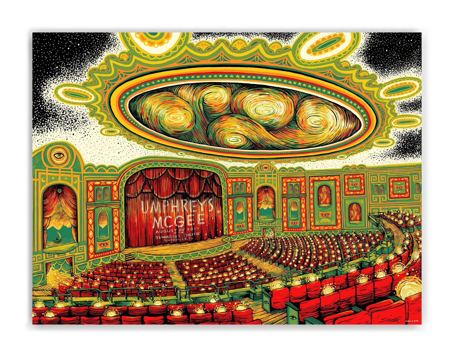 "Opening Scene" is an 18" x 24" 6 color screenprint on Cougar Natural White paper for the Umphrey's McGee show at the Tennessee Theatre in Knoxville. Prints are hand signed and numbered in a limited AP edition of 40.